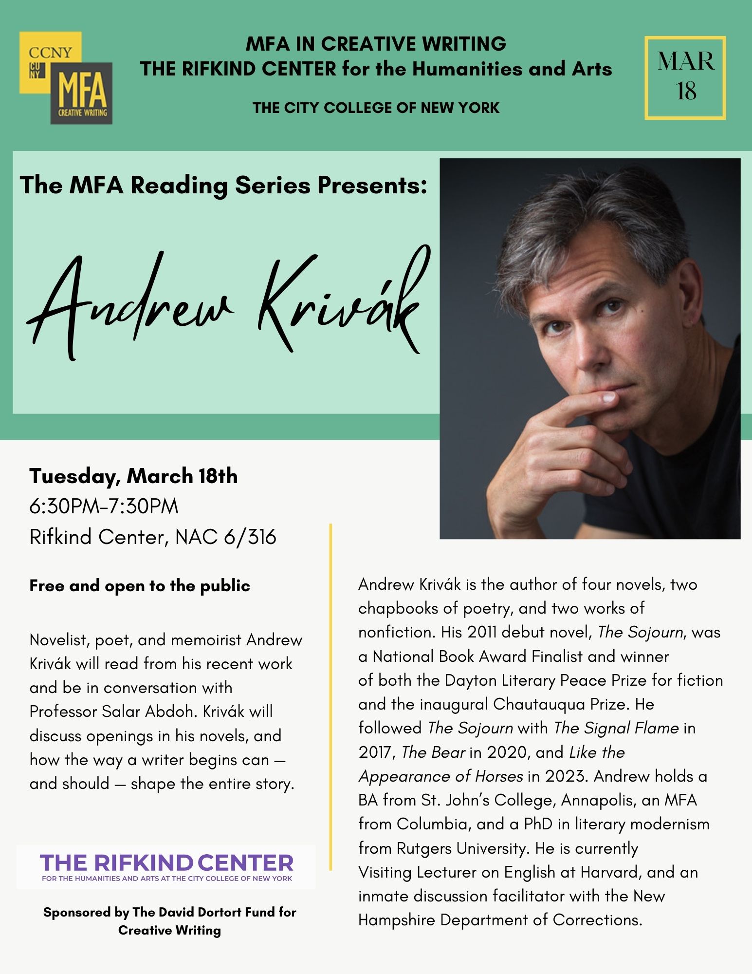 Novelist, poet, and memoirist Andrew Krivák will read from his recent work and be in conversation with Professor Salar Abdoh. Krivák will discuss openings in his novels, and how the way a writer begins can — and should — shape the entire story.
